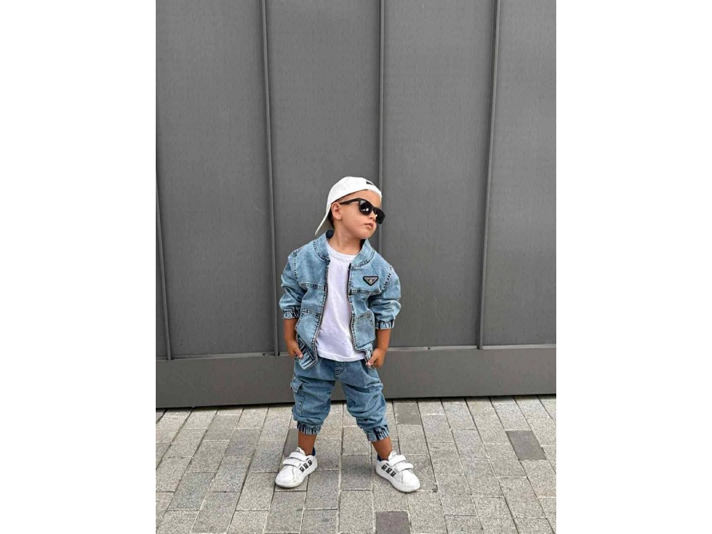 3 dielny rifľový komplet - rifľová bunda, rifle a biele tričko s dlhým rukávom.