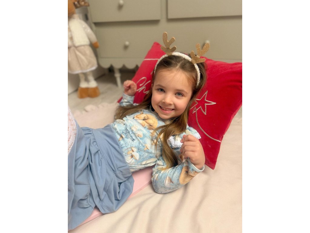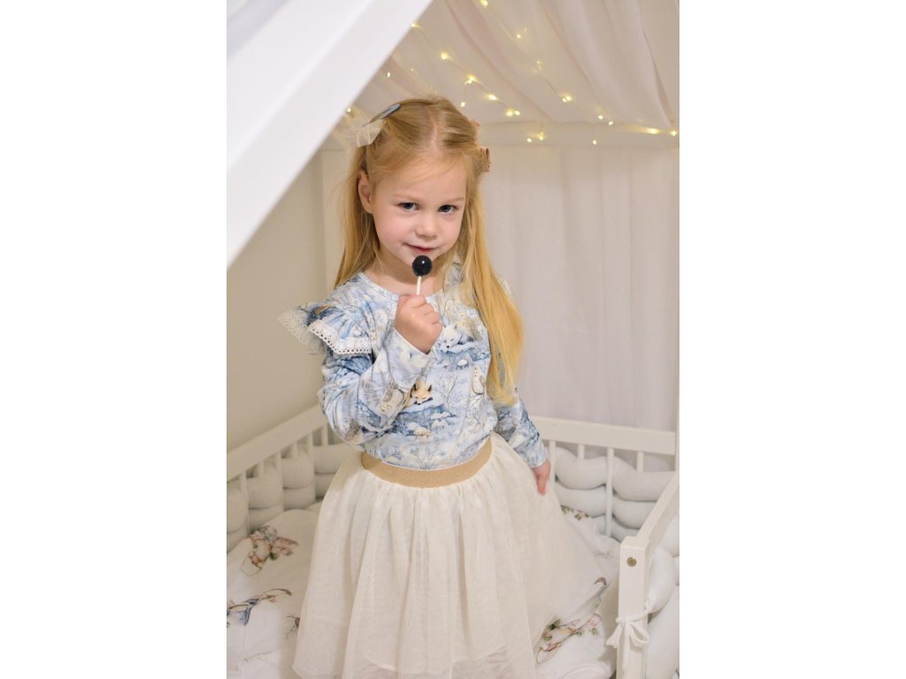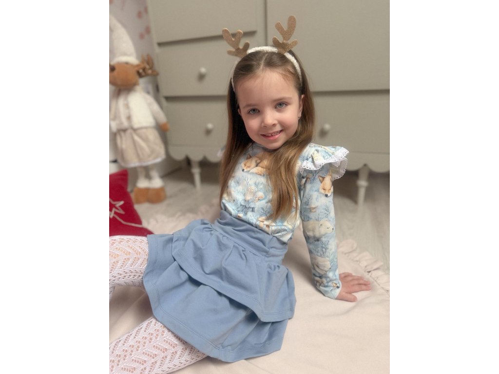 Svetlomodrý podklad zdobia jemné motívy lesných zvieratiek a hubiek, ktoré pôsobia zimne a rozprávkovo.