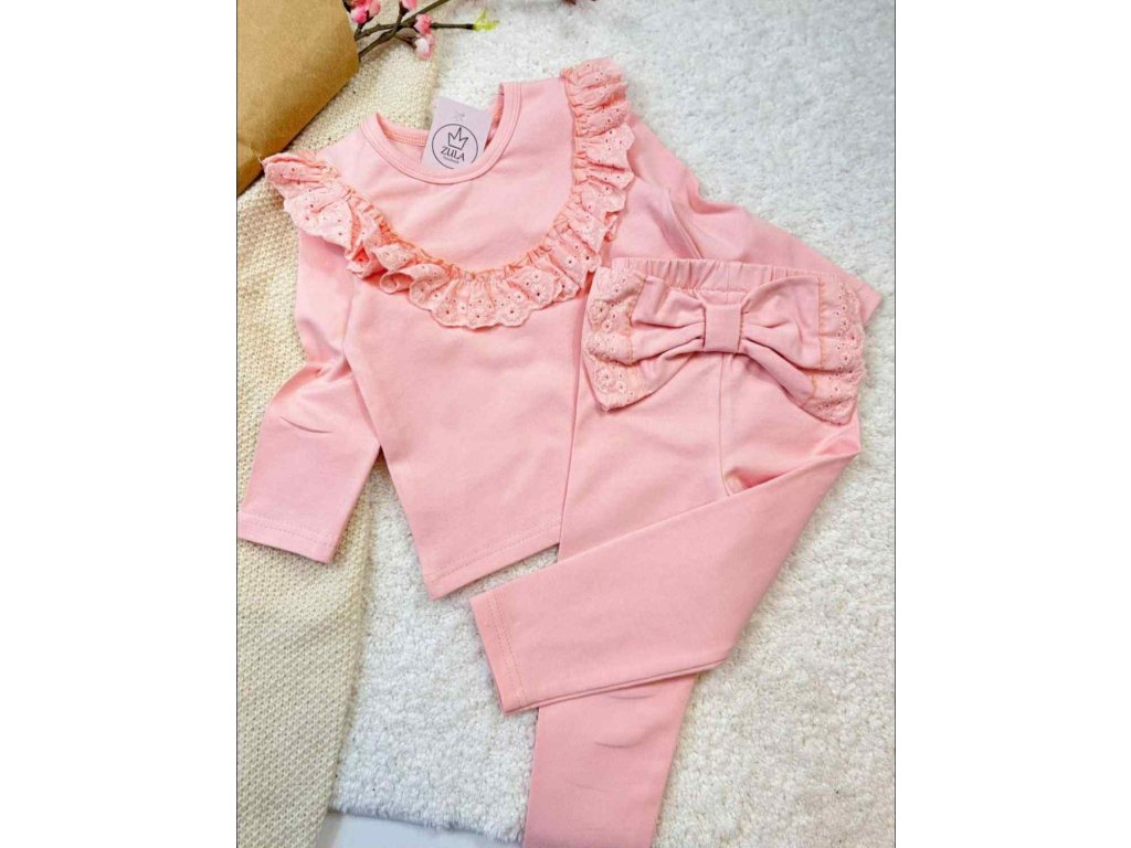 Tričko s dlým rukávom a ozdobným volánom a legínky s mašľou.