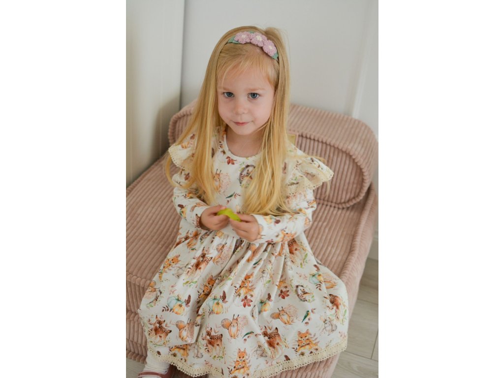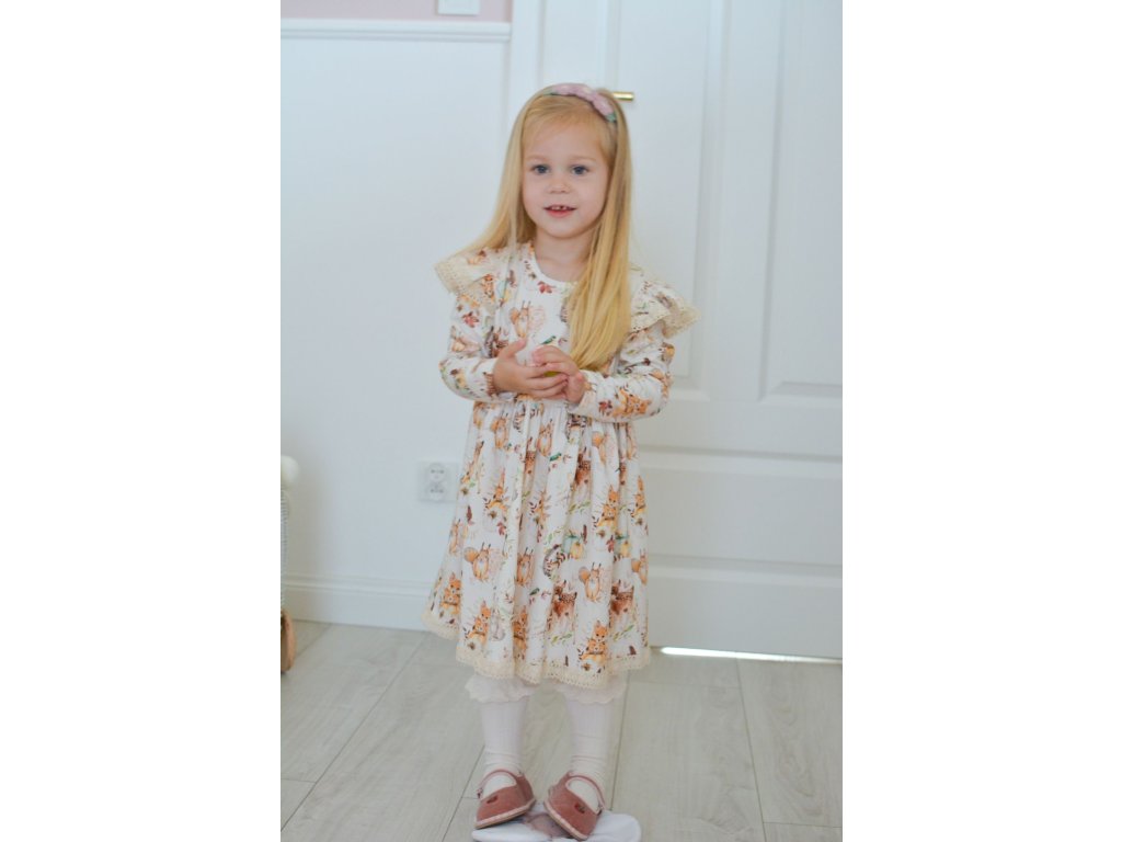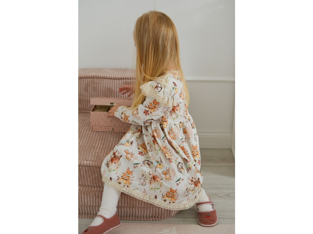 Rozkošné dievčenské šaty v krémovom odtieni s jemnou potlačou lesných zvieratiek. Vďaka dlhému rukávu a pohodlnému strihu sú ideálne na chladnejšie dni. Romantický vzhľad dotvára čipkovaný lem na ramenách a spodnom okraji šiat.
