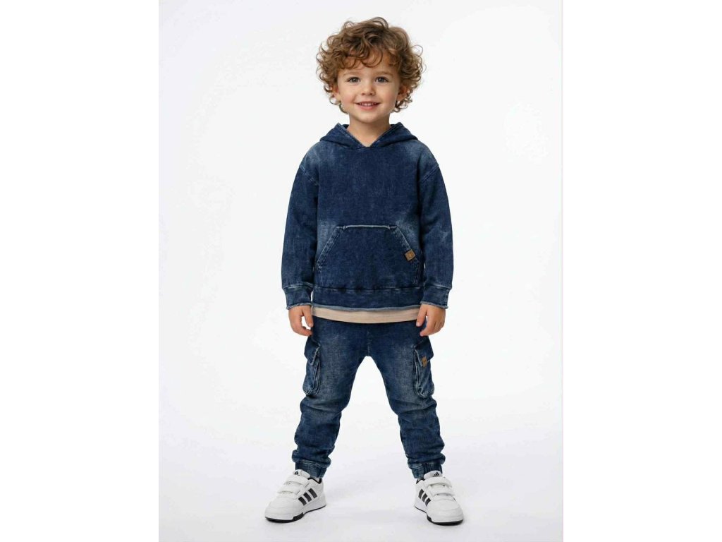 Súprava sa skladá z 2 vecí mikina na zips s kapucňou a riflové nohavice s vreckami.